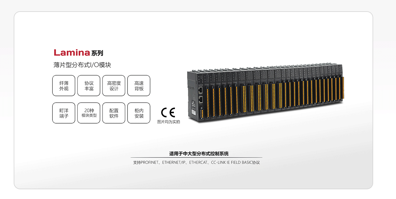 LAMINA系列薄片式遠(yuǎn)程I/O,是展示期間最受客戶關(guān)注的產(chǎn)品。該系列I/O支持5種PLC總線協(xié)議,其中包括PROFINET,EHTERNET/IP,ETHERCAT,CC-LINK IE FB,MODBUS TCP。可支持32個(gè)模塊擴(kuò)展,無需饋電模塊,模塊種類豐富,包含了數(shù)字量輸入輸出,模擬量輸入輸出,熱電偶,熱電阻,脈沖輸入、輸出,定位、485/232等多達(dá)20多種功能模塊。